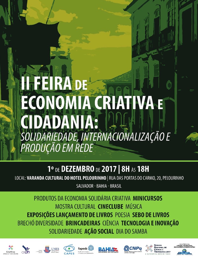 O Centro de Referência em Desenvolvimento e Humanidades (CRDH) da Universidade do Estado da Bahia (UNEB), através de sua Incubadora CriaAtiva de Empreendimentos Econômicos e Solidários (EES), está promovendo no dia 01 de dezembro do corrente ano, das 08h às 18h, a II FEIRA DE ECONOMIA CRIATIVA E CIDADADANIA, que vai reunir mais de 30 (trinta) EES de todo o estado da Bahia, atrações culturais, apresentações artísticas, música, poesia e ciência. Este evento que integra a Semana Nacional de Ciência e Tecnologia da UNEB se constitui como um espaço público para livre circulação de ideias e pessoas, onde a economia solidária pode mostrar sua produção seja ela de produtos, serviços, processos ou tecnologias sociais com foco na economia criativa.