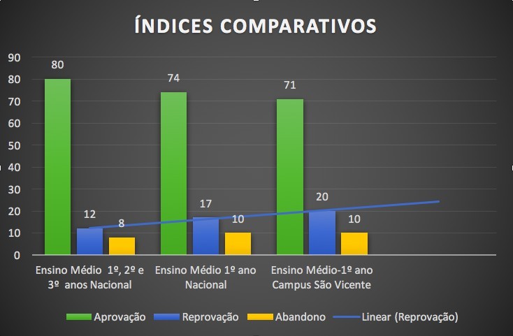 O gráfico demonstra que o Campus São Vicente tem índice de reprovação maior do que a média nacional, tomando por base o 1º ano do Ensino Médio, no ano de 2014 e que a taxa de abandono é igual da média nacional. Estes números devem gerar um debate interno em busca de soluções para garantir não somente o ingresso, mas a permanência e o êxito destes estudantes no Ensino Médio Técnico. Um outro fator preocupante é que o ingresso nesta instituição se dá através de processo seletivo onde o conhecimento nas áreas de Língua Portuguesa e Matemática definem os ocupantes das 180 vagas anuais ofertadas. O Campus São Vicente faz parte dos 17 outros campi no estado de Mato Grosso, o IFMT em atendimento à Nota Informativa 138/2015 e ao Acórdão 506/2013 que indicou que a Secretaria de Educação Profissional e Tecnológica instituísse, em parceria com os Institutos Federais, um plano[2] voltado ao tratamento da evasão na Rede Federal de ensino.