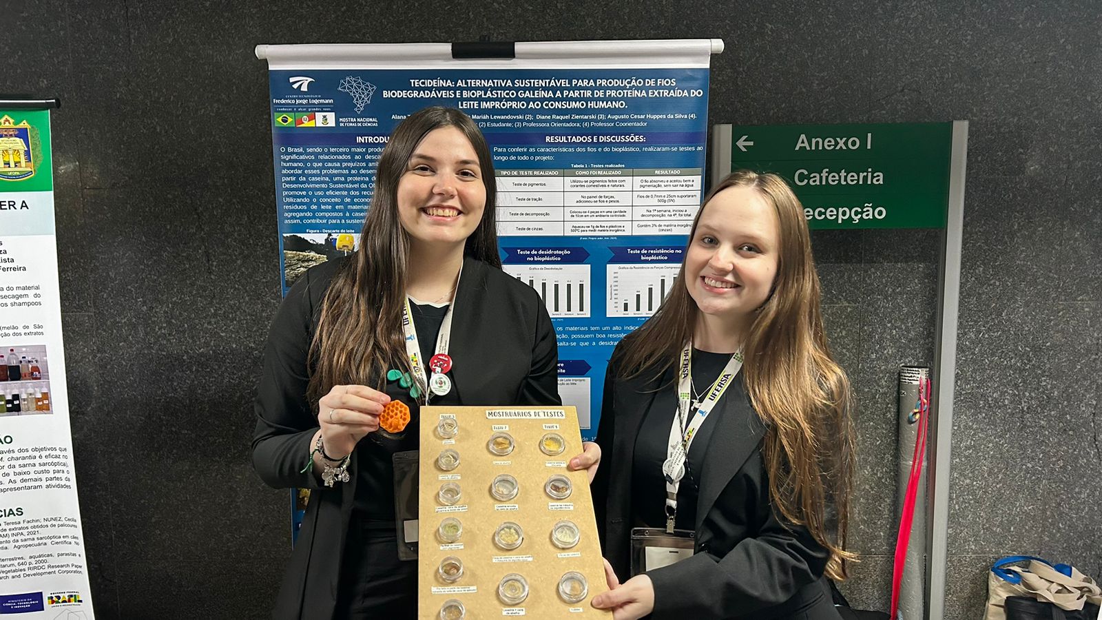 Josué Isaque, aluno do Colégio Dário Gomes de Lima, localizado em Flores (PE), criou um projeto que produz ração para cachorros abandonados. “Para mim é um sonho realizado estar aqui, na feira, ainda mais apresentando a minha ideia. Essa é uma experiência nova e única, que me permite conhecer outras pessoas e aprender sobre temas diferentes”, afirmou.Já as alunas Gabrielle Lewandousk e Alana Hatzel, do Centro Tecnológico Frederico Jorge Logemann (CFJL), de Horizontina (RS), criaram um projeto que reutiliza leite descartado para produzir fios biodegradáveis. Elas também comentaram sobre a importância da participação no evento. Segundo Hatzel, “estar na feira, conversando sobre o tema e conhecendo ideias e projetos de diferentes locais, é uma oportunidade única. Nós nunca imaginamos poder estar tão perto das pessoas que fazem a ciência no país acontecer e poder conhecer tantas ideias”.